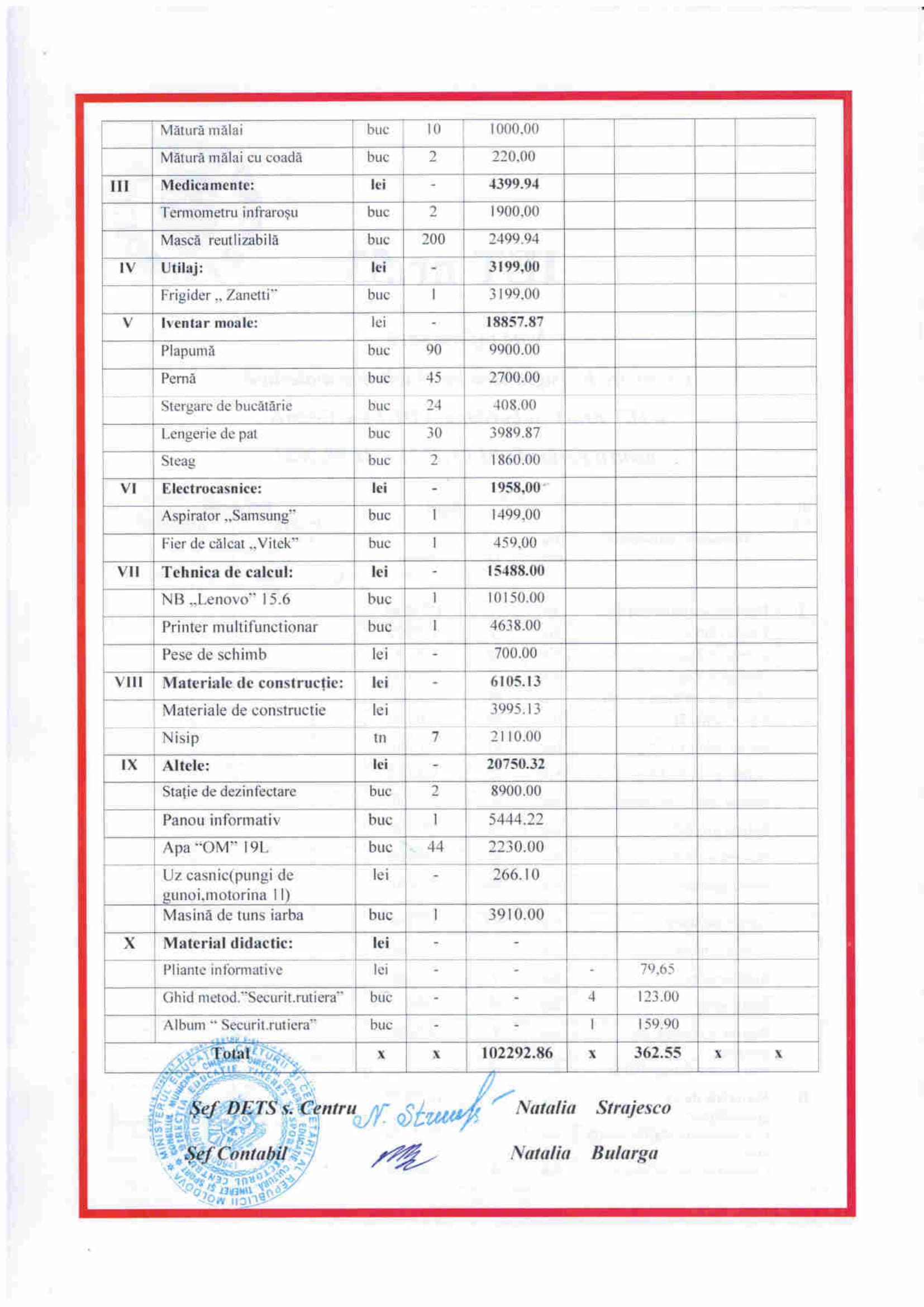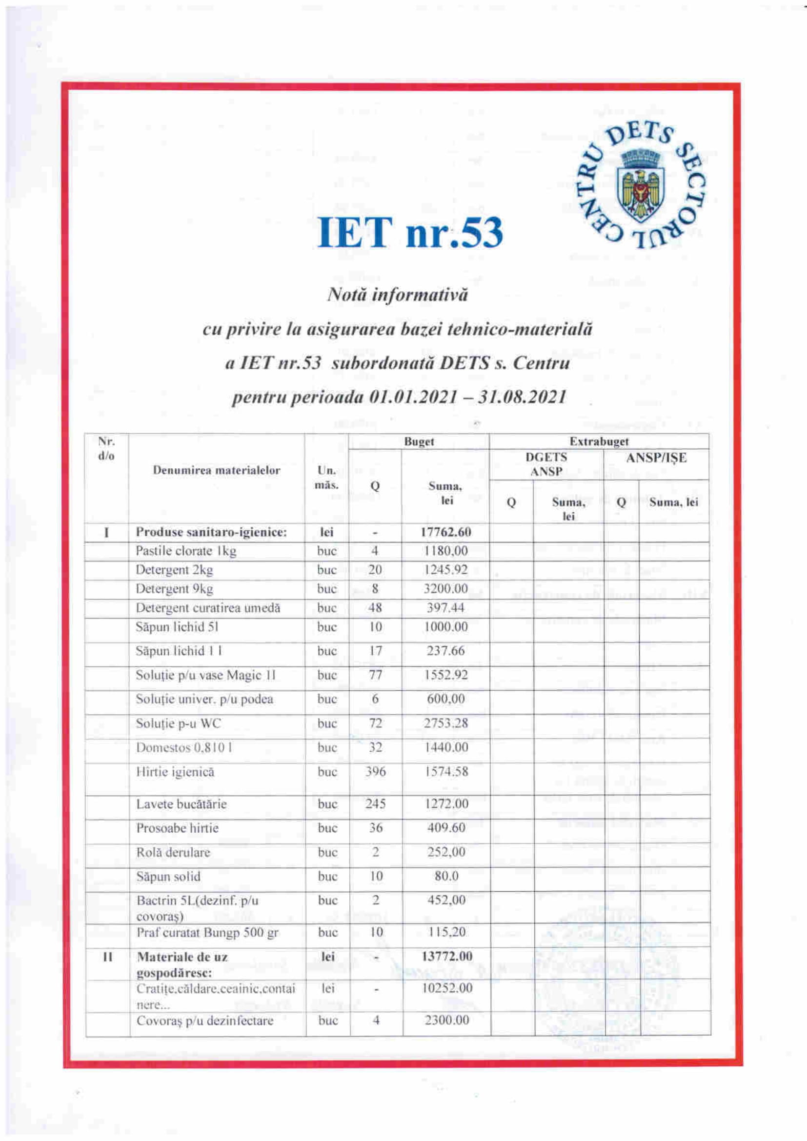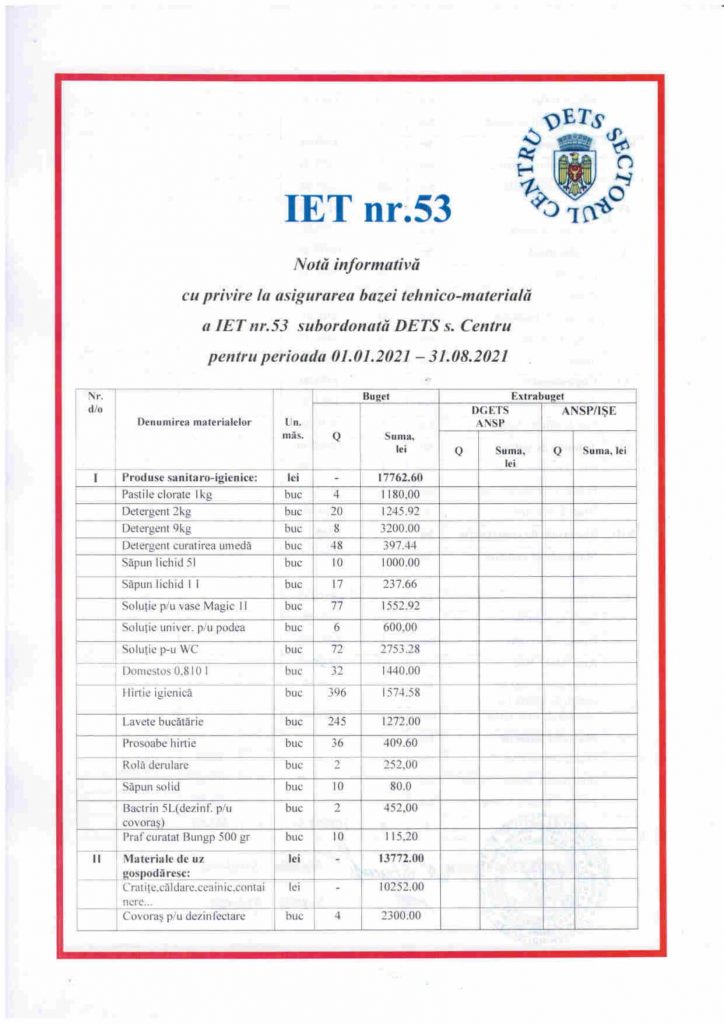 Asigurarea bazei tehnico-materiala a instituțiilor pentru perioada 01.01.2021-31.08.2021